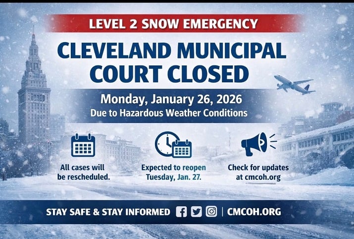 The Cleveland Municipal Court will be closed Monday, January 26, 2026 due to the Level 2 snow emergency and hazardous weather conditions. All cases scheduled for Monday will be rescheduled. Parties will receive notice of new court dates by mail. The Court currently expects to resume normal operations on Tuesday, January 27, 2026. Please monitor our website and social media for updates.