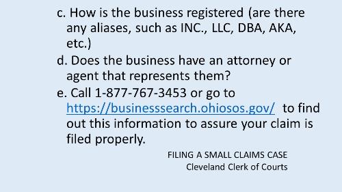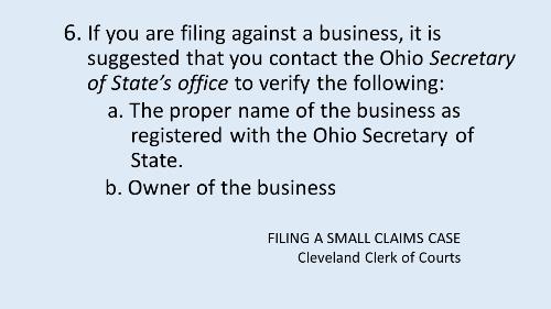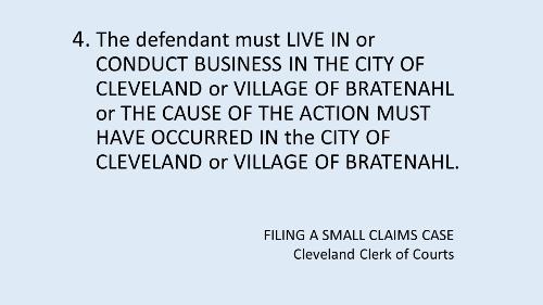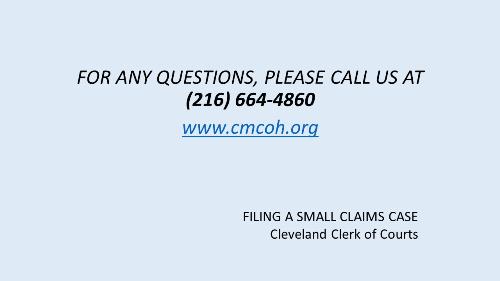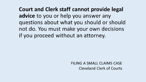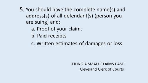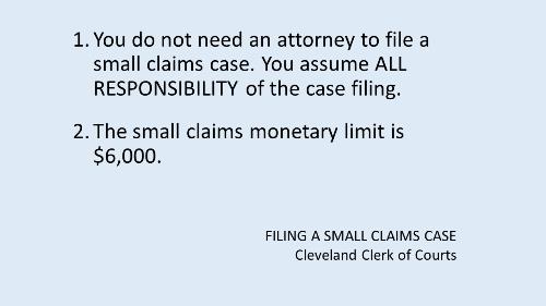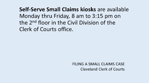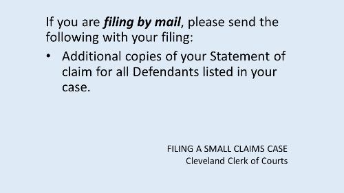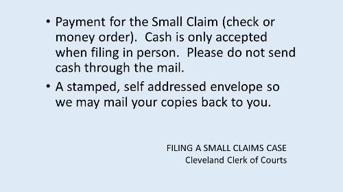 - Filing your Small Claim by Mail. Make sure all your forms are filled out legibly and correctly. Make sure you have the correct number of copies (one copy for each party involved) and the original Small Claims Complaint is signed. Your check or money order should be made payable to the Cleveland Municipal Clerk of Court. The filing fee is $37.00, which includes one defendant. Please include $7.00 for each additional defendant. Please include a stamped, self-addressed envelope with your mailings. We use this envelope to send a time stamped copy of your complaint, together with your receipt and hearing date and phone numbers to call to confirm your hearing date is going forward.