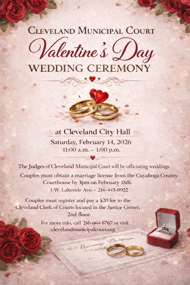 The Cleveland Municipal Court will be officiating weddings on Valentine’s Day at Cleveland City Hall starting at 11:00 am on Saturday February 14, 2026. Any couple interested must arrange for their marriage license